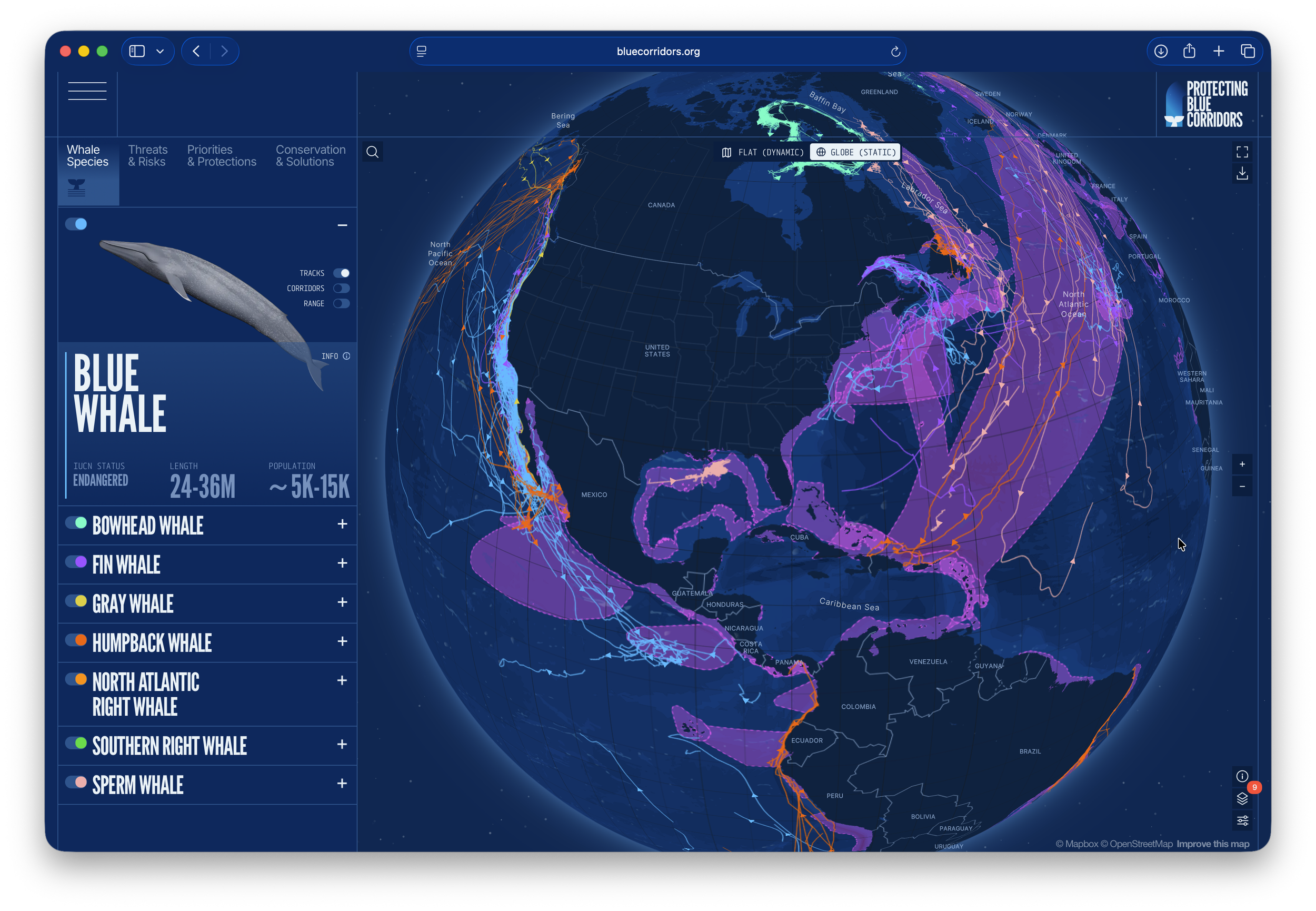 Interactive mapping tool from BlueCorridors.org. It will expand later in 2026 to include more species, movement data, and other visualizations.